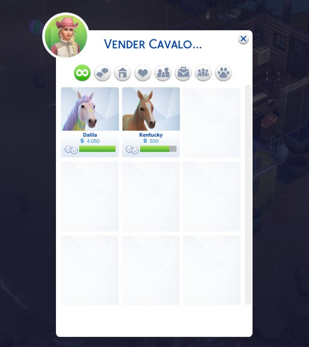 Aumente a Habilidade de Temperamento com cuidados e socializações entre Sims e equinos ou enviando o Cavalo para treinar usando o Quadro Comunitário de Rancho. |