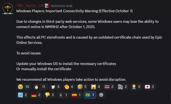 |No último dia 18 de setembro, a equipe de No More Room In Hell 2 (NMRIH2) emitiu um alerta importante para jogadores que usam Windows: A partir de 1º de outubro de 2025, alguns usuários podem perder a capacidade de se conectar online no jogo. Isso se deve a mudanças em serviços web de terceiros, mais especificamente à cadeia de certificados desatualizada usada pelos Epic Online Services, que é a plataforma responsável por gerenciar conexões multiplayer e autenticação no jogo.