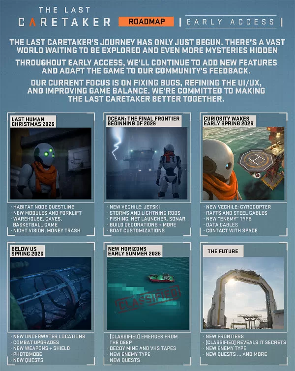 Antti Ilvesuo, cofundador da Channel37, comentou: “Estamos muito felizes por compartilhar a nossa visão com os jogadores e temos um compromisso com o futuro de longo prazo de The Last Caretaker”. Ele continuou: “Queríamos criar um universo que parecesse possível, é uma sobrevivência que faz sentido. Compartilhar este plano de ação agora mostra a nossa intenção. Vamos entregar tudo isso e muito mais à medida que nos aproximarmos do lançamento completo em 2026”.