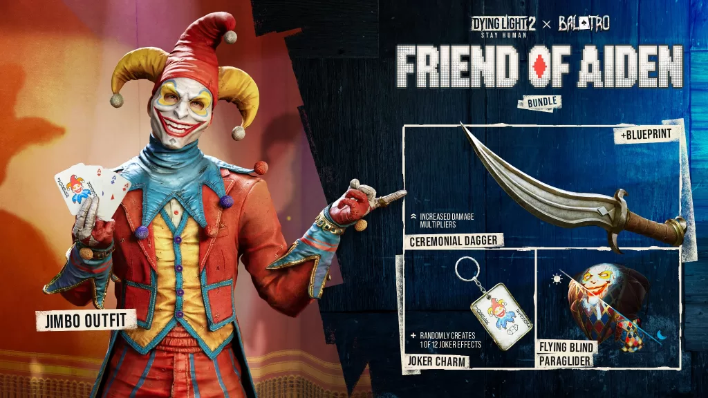 Prepare-se para uma colaboração inesperada entre Dying Light 2: Stay Human e Balatro. O Pacote Dying Light 2 x Balatro: Friend of Aiden oferece duas novas missões secundárias e itens gratuitos divertidos, entre eles o Joker Charm, que está em constante mudança similar a própria essência de azar e imprevisibilidade de Balatro. Sempre que você o equipa, um teste de sua própria sorte acontece, com seus efeitos sendo ativados aleatoriamente, trazendo a emoção característica de Balatro para Villedor.
